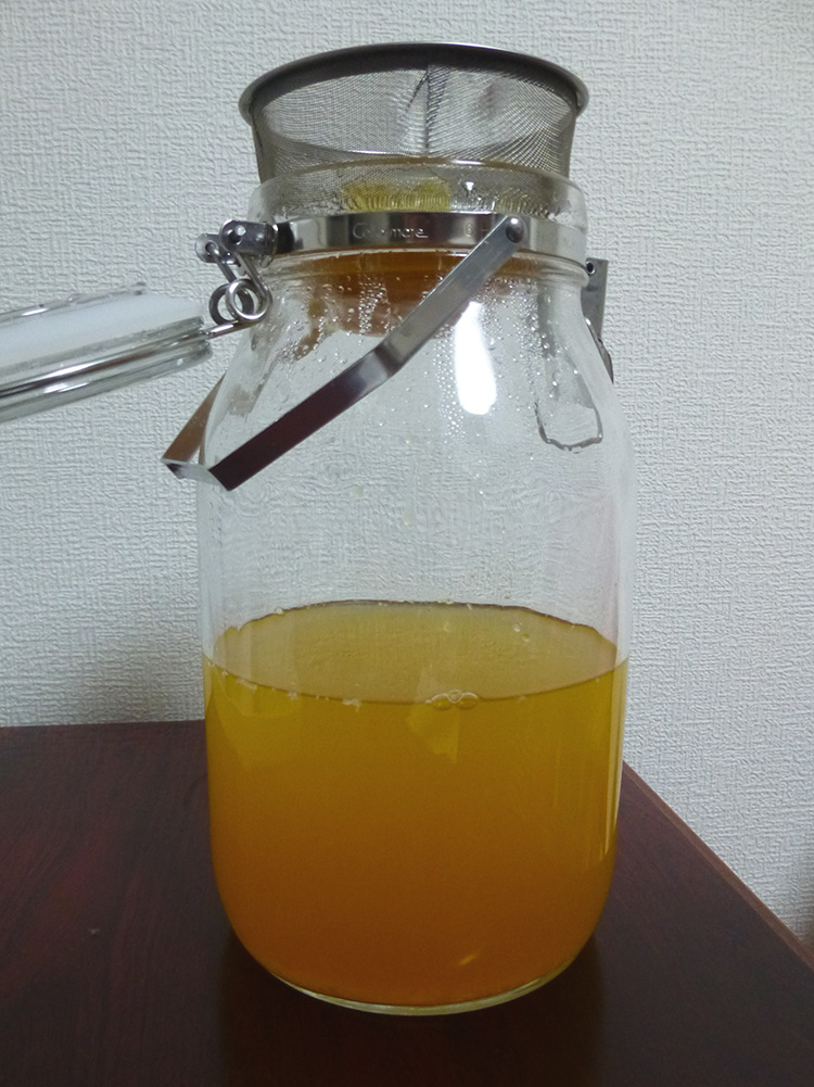 上になんか、これ多分やかんの中に入ってた茶こし部分かな、これを乗せて果汁を注ぐ