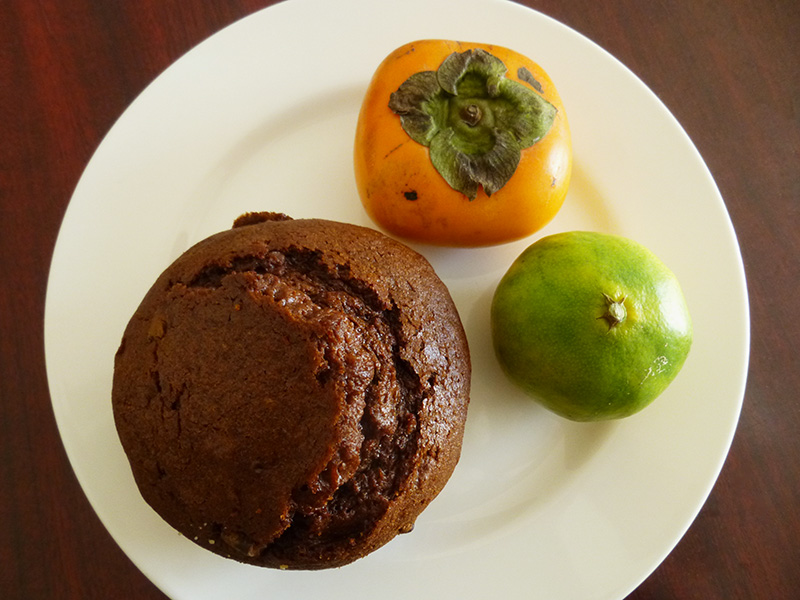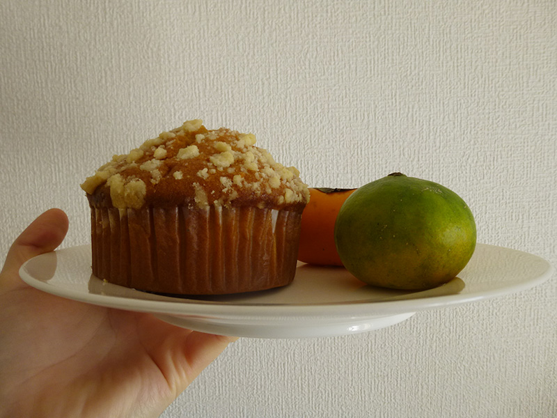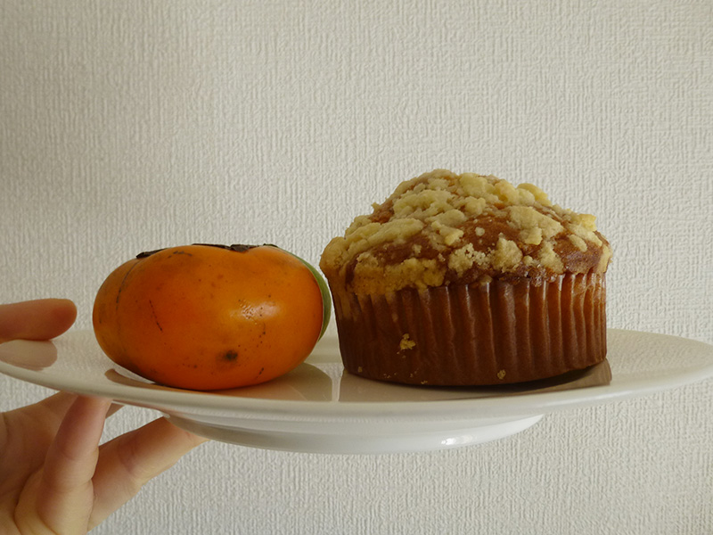 んで、マフィンの大きさを伝えるべく、とりあえずお皿の上に、比較対象の柿とみかんとを載せて写真を撮ってみました。