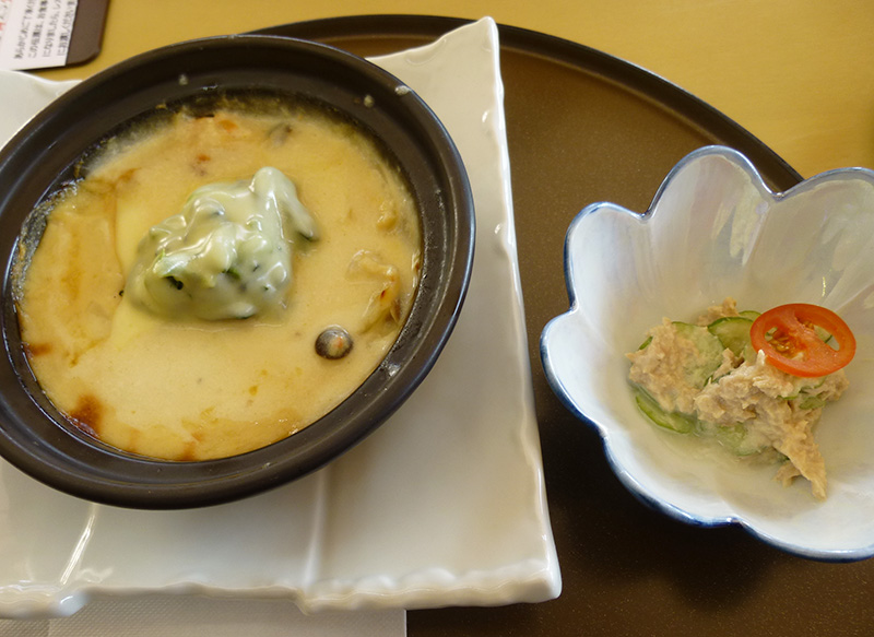 これが私の注文した海老グラタン(と「きゅうりとツナマヨ和え」の小鉢)。