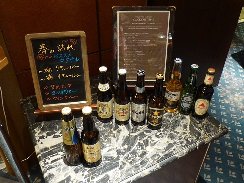 こちら、ラウンジ入り口付近。ビール瓶がディスプレイされていますな。